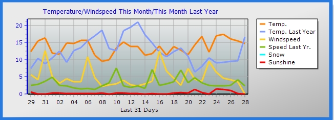 Maximum windspeed = 13.0 kmh from 022°(NNE) on day 07 at time 15:27
